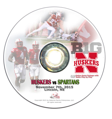 November 7th, 2015 in Lincoln. 39-38 good-guys-win thriller over 7th ranked Michigan State! Tommie Armstrong takes the team, the coaches, the fans, and the state on his shoulders as he goes 6-10 for 140 yards and 1 TD, while running for two more TD's in the final quarter, propelling NU past an 11 point deficit with 3 minutes left in the game. Jordan Westerkamp takes a beating while snaring 9 passes for 143 yards and 1 TD, and home-town hero Brandon Reilly grabs the game-winning 30 yarder with :30 remaining to play. The never-say-die Huskers finally get a close one to break their way in the biggest game of the season, sending a shock-wave of euphoria through an electrified stadium and a 10 minute post-game jubilee rivaling those after Sooner wins of yesteryear! Game DVD includes entire game footage as filmed by Husker Vision, complete with radio play-by-play for audio.Includes Tunnel Walk and post game interviews. 105 minutes.