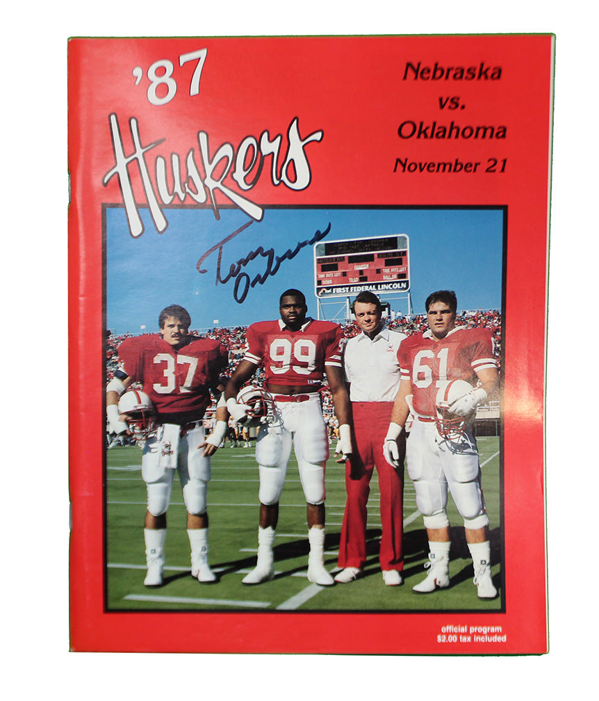 Rare collectible, featuring Doug Welneik, Neil Smith, John McCormick and coach Osborne on the cover. Labeled "Game of the Century II" with #1 NU hosting #2 OU, the game did not go as hoped, with OU QB Charles Thompson and friends running wild in a 17-7 loss. Full 1987 OU game program, very good condition. Hand signed by coach Osborne, certificate of authenticity included. Coaches proceeds to TeamMates Mentoring Program.