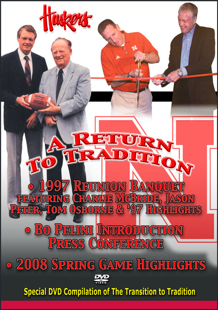 DVD: A Return To Tradition. A DVD compilation of the historical events marking the move back to Nebraska Football Tradition in 2008. See the full footage of the 1997 Championship reunion banquet featuring Charlie McBride, Jason Peter and Coach Osborne. It was the middle of the '07 season when the banquet took place, and things were looking tough for the '07 Huskers. Hear the amazing insights and heart warming reflections offered by the former coaches and players, including some hilarious comments from the always entertaining Jason Peter. See the imploring request from coach Osborne for the '97 players to show their support and encouragement to the embattled 2007 Huskers. Also see the entire Bo Pelini introduction press conference and hear Bo set forth in his own words his vision for bringing tradition back to NU. And finally see highlights from the 2008 Spring Game, complete with the post game comments from coach Pelini and select players. 2007 was a tough year, but the future looks bright! DVD video, Husker Vision footage, 140 minutes.