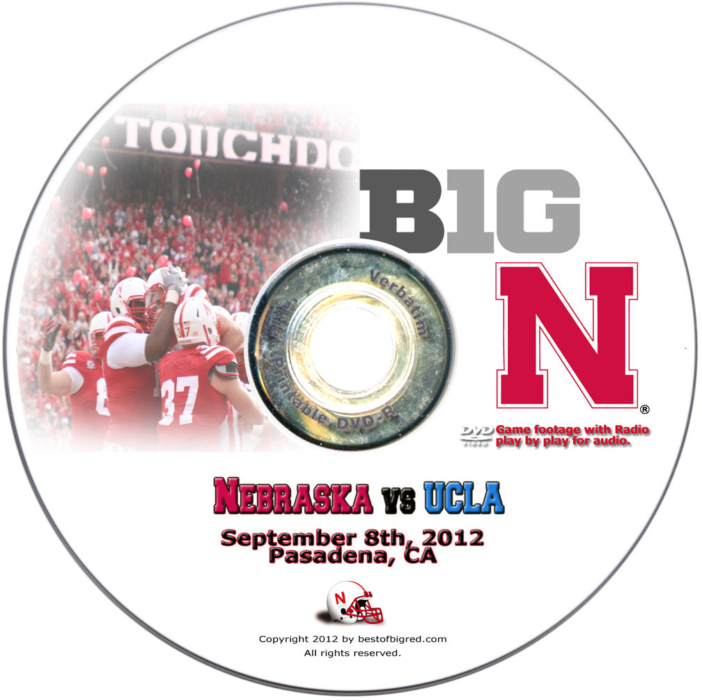 September 8, 2012 - Pasadena, CA. There were plenty of fireworks in this highly-anticipated matchup between these two storied programs. The Huskers start slowly but end the first quarter with a 14-7 lead after an electric, 92-yard touchdown run by Taylor Martinez. NU battles momentum swings and their own mistakes but has a chance late in to the game until Martinez is sacked in the end-zone for a safety with 8:44 left to play. Ameer Abdullah fills in nicely for the injured Rex Burkhead gaining 119 yards on the ground but the Bruins prove to be too much for the Blackshirts with a final score of 36-30. Includes video footage of entire game as filmed by Husker Vision. Husker radio play-by-play for audio. DVD video, 105 minutes.