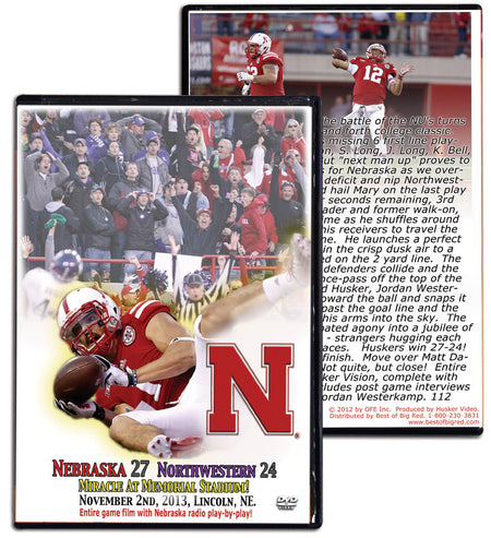 11-2-13, Lincoln, NE. The battle of the NU's turns out to be a crazy back and forth college classic. NU's vaunted offense is missing 6 first line players: J. Turner, J. Cotton, S. Long, J. Long, K. Bell, and Taylor Martinez. But "next man up" proves to be a mantra that works for Nebraska as we overcome a 21-14 halftime deficit and nip Northwestern on a classic 50 yard hail Mary on the last play of the game. With four seconds remaining, 3rd team QB, and senior leader and former walk-on, Ron Kellogg III, buys time as he shuffles around the pocket waiting for his receivers to travel the 50 yards to the end zone. He launches a perfect spiral, arcing 60 yards in the crisp dusk air to a cluster of purple and red on the 2 yard line. The group of receivers and defenders collide and the ball careens off the top of the pile to a lone wide-eyed Husker, Jordan Westerkamp, who cuts back toward the ball and snaps it out of the air 6 inches past the goal line and the ref immediately raises his arms into the sky. The crowd erupts from its bated agony into a jubilee of screams and high fives - strangers hugging each other in euphoric embraces. Huskers win 27-24! A must-see-to-believe finish. Move over Matt Davison '97 kick catch? Not quite, but close! Entire game as filmed by Huskers Vision, complete with radio play by play. Includes post game interviews with Ron Kellogg and Jordan Westerkamp. 112 minutes, DVD video.