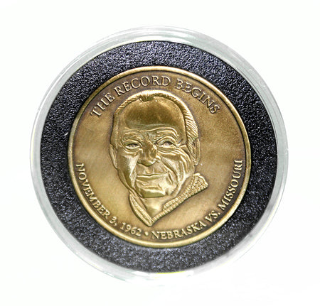 2 inch Brass plated coin. Replica of the actual coin tossed at the 300th sellout game. Has picture of Bob Devaney on one side, starting the tradition, and 300th logo on the other. Limited Edition, only one available.