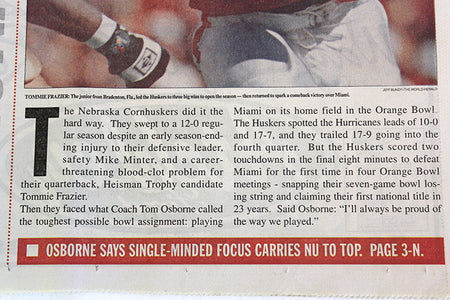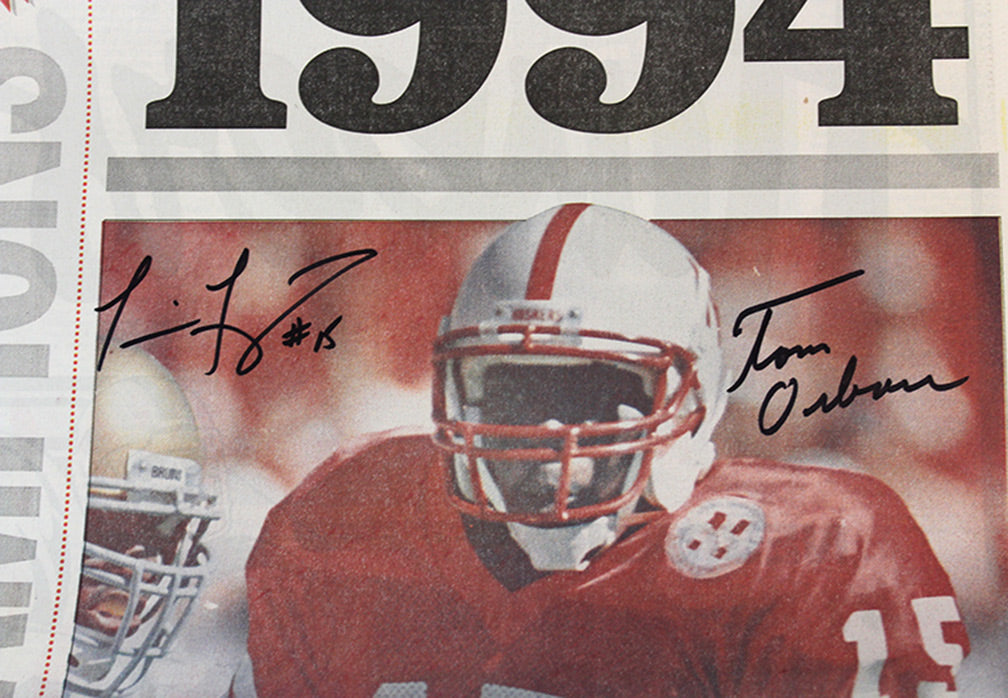 Authentic Omaha World Herald (Jan. 3, 1995) special section lauding the Orange Bowl win and 1994 National Title. Complete special section. Very good condition. Hand signed by Tommie Frazier and Tom Osborne, certificate of authenticity included. Only 1 available.