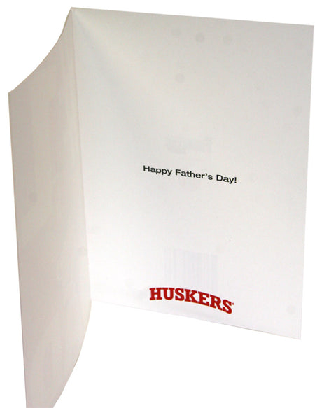 5 by 7 inch folded card with envelope. Inside of card reads "Happy Father's Day!" and includes Husker logo.