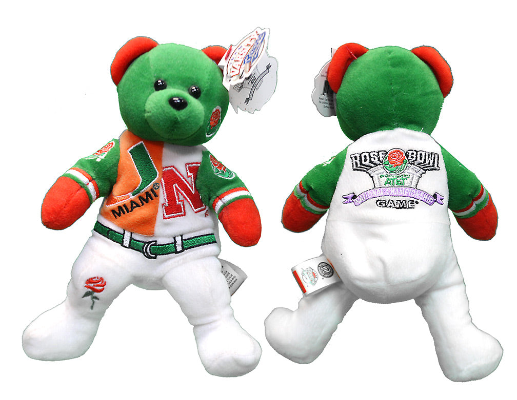 Husker battled the Hurricanes for the 2001 National Title in the 2002 Rose Bowl. Very Rare 2002 Rose Bowl Beanie Bear featuring Huskers and Hurricanes and Rose Bowl logos. New Condition, 8 inches, one available.