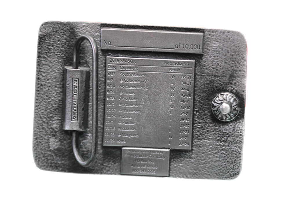 Big Red Country Belt Buckle featuring the 2019 schedule on the backside of the buckle. Pewter limited edition buckle.