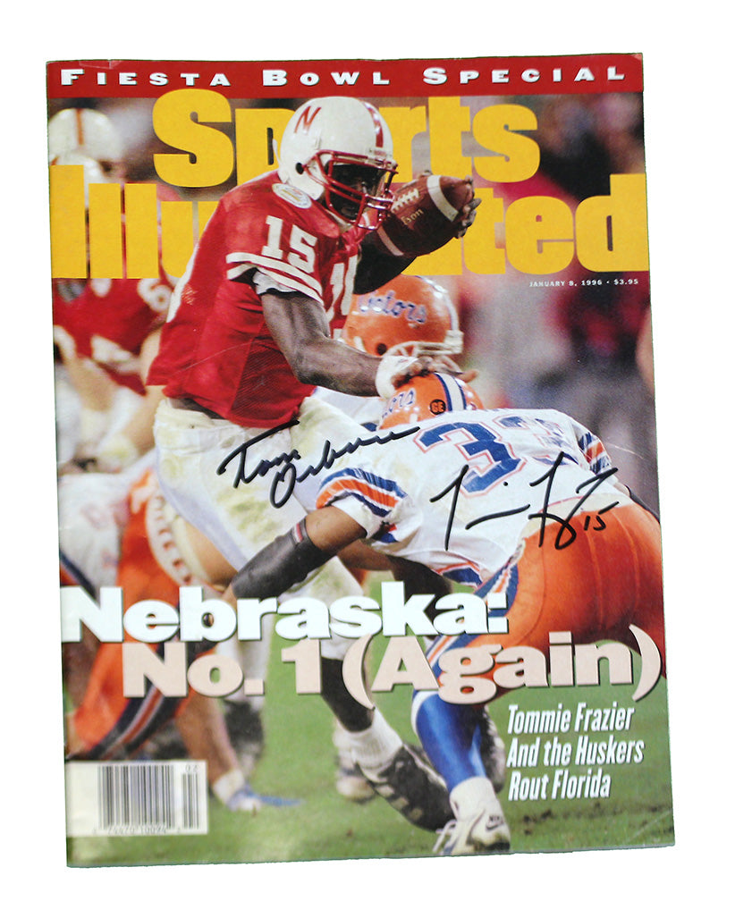 1995 National Title Sports Illustrated. Was there a greater time to be a Husker than the 96 Fiesta Bowl? T. Frazier and crew forever silenced the critics. Rare weekly SI hand signed by coach Osborne and Tommie Frazier. Coaches proceeds to TeamMates Mentoring Program. Only 1 available. Certificate of Authenticity included.
