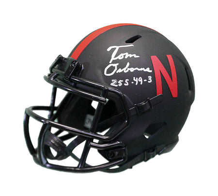 Matted black speed helmet hand signed by Tom Osborne with career record. Certificate of Authenticity included.