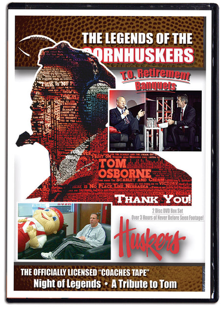 Spring 2013 retirement gala events: “Night of Legends” hosted by Chris Fowler AND “A Tribute to Tom” emceed by Trev Alberts. The spirit of the Nebraska program that was born in ‘62 under Devaney and cultivated to present day is captured in the 3+ hours of stories, lessons, tall tales, video highlights, and remembrances during the 2 banquets honoring coach Osborne's 50 years as a coach, administrator, and leader. A few of the many memorable moments include: Coach Osborne reflects on the ingredients in NU's 50 years of success, Irving Fryar's heartfelt tribute to coach, Milt Tenopir's recruiting story, coach McBride's description of Nancy Osborne's role in the loyalty of staff members, Larry The Cable Guy’s tattoo, Billy Simms and Jim Pillen (78 OU game fame) meet again, coach Switzer and Stoops tell stories, Chris Fowler and the Game Day Crew, Coach Pelini analysis of NU's "Harlem Shake" video and footage of his counseling of Lil Red, and much much more! 2 Disc DVD box set, 180+ minutes of never before seen footage. $1.00 to TeamMates Mentoring Program per box set sold.